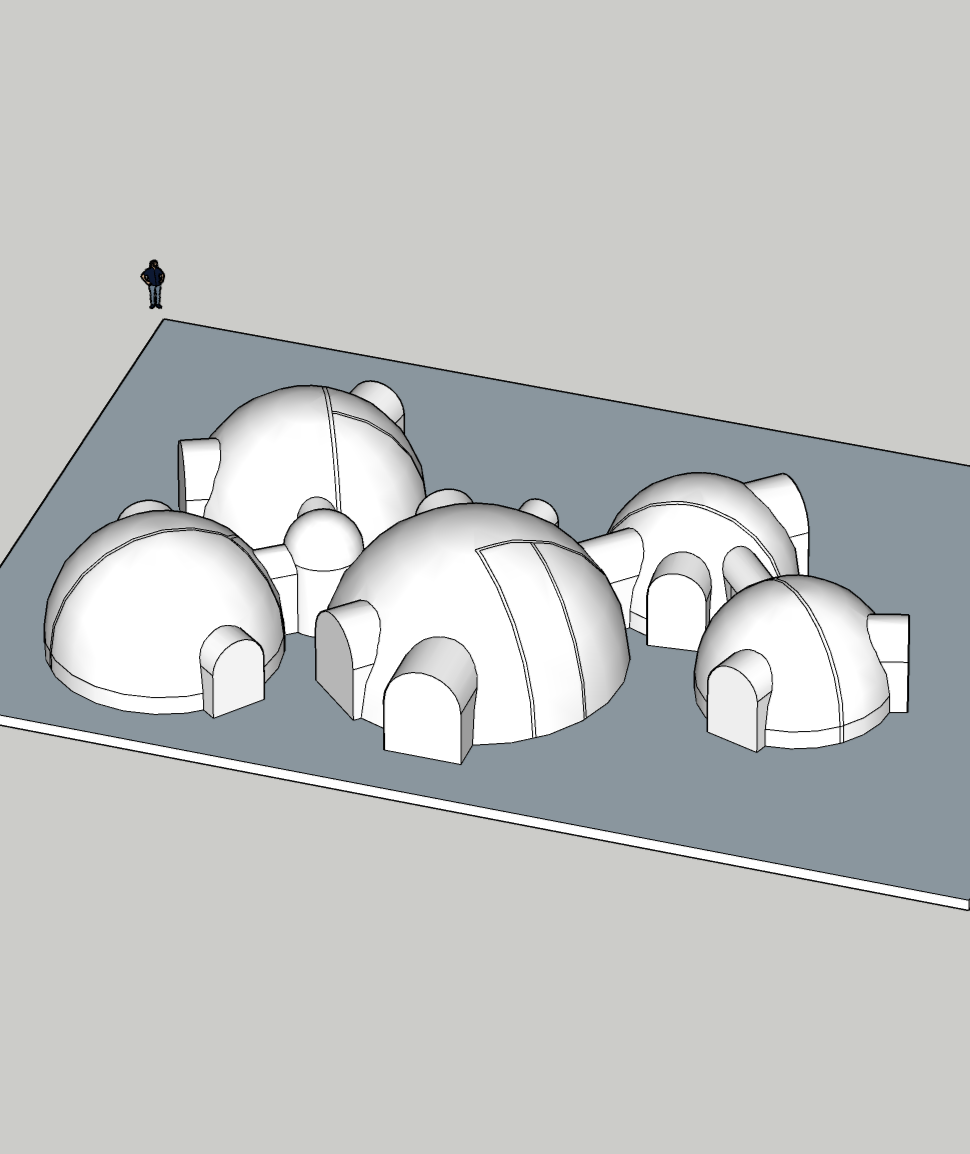 With that information we were able to figure out the final shape/configuration of all the domes together. With the layout set (kind of) we then were able to use an application called SketchUp (link to website) to create a 3D drawing of our space. This helped us to visualize and get on the same page. It also is great for planning additional height we will be adding to some of the smaller domes. Some of our domes will be what is considered Roman building style. The half sphere will be on top of x number of non-angled rows of block.